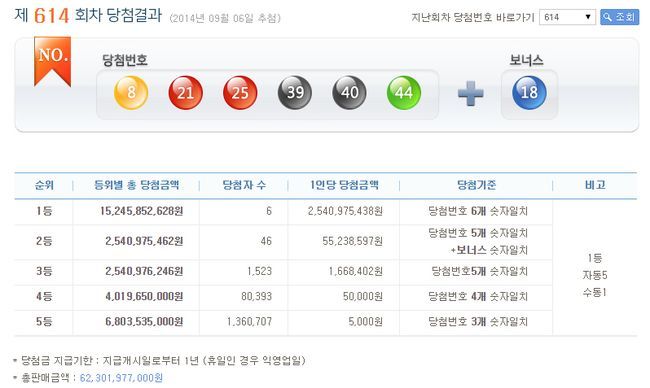 로또614회당첨번호는 6일 SBS 방송을 통해 추첨된 결과 8, 21, 25, 39, 40, 44가 뽑혔다. 1등에게는 총 152억 4585만 2628원의 상금이 지급될 예정이다. 2등은 로또614회당첨번호 5개와 보너스 숫자 18이 일치하는 46명이다. 3등의 경우에는 로또614회당첨번호 중 5개만 맞으면 된다.