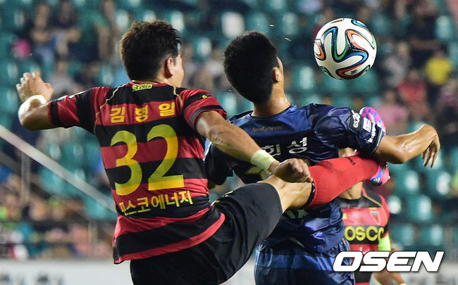 7일 오후 포항 스틸야드에서 열린 '현대오일뱅크 K리그 클래식 2014' 포항 스틸러스와 FC 서울의 경기 전반 김형일과 박희성이 공중볼 다툼을 하고 있다.