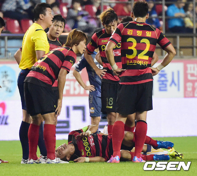 7일 오후 포항 스틸야드에서 열린 '현대오일뱅크 K리그 클래식 2014' 포항 스틸러스와 FC 서울의 경기 전반 포항 황지수가 고요한과 충돌 후 고통스러운 표정을 짓고 있다.