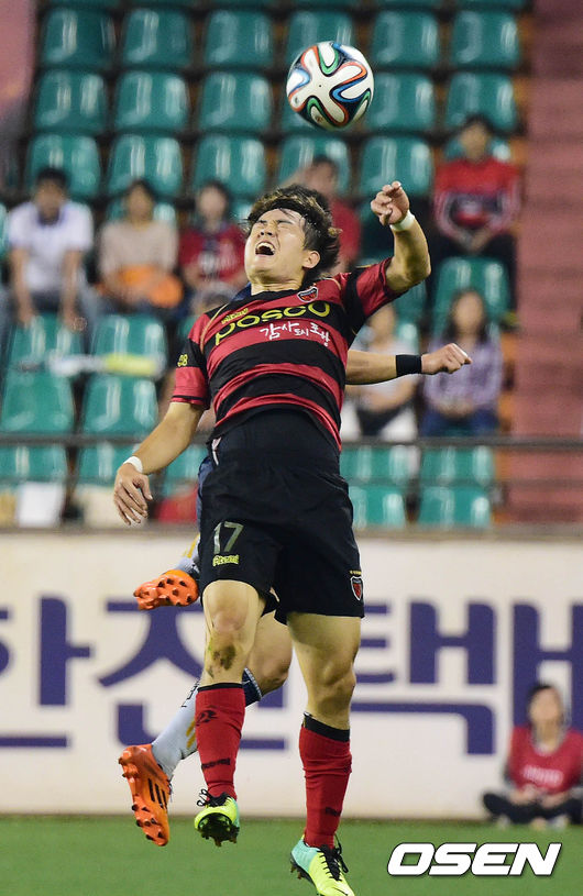 7일 오후 포항 스틸야드에서 열린 '현대오일뱅크 K리그 클래식 2014' 포항 스틸러스와 FC 서울의 경기 전반 신광훈이 공중볼다툼을 하고 있다.