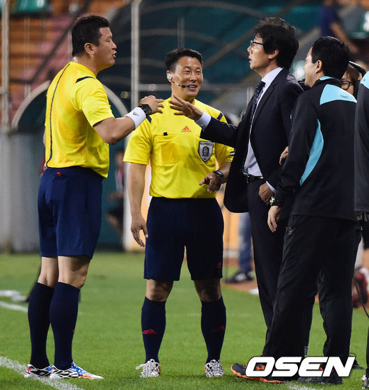 7일 오후 포항 스틸야드에서 열린 '현대오일뱅크 K리그 클래식 2014' 포항 스틸러스와 FC 서울의 경기 전반 황선홍 감독이 심판의 판정에 항의를 하고 있다.
