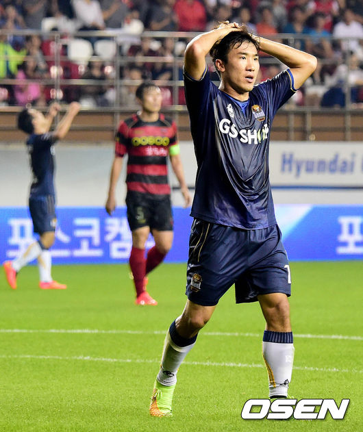 7일 오후 포항 스틸야드에서 열린 '현대오일뱅크 K리그 클래식 2014' 포항 스틸러스와 FC 서울의 경기 전반 고요한이 자신의 슛이 빗나가자 아쉬워하고 있다.