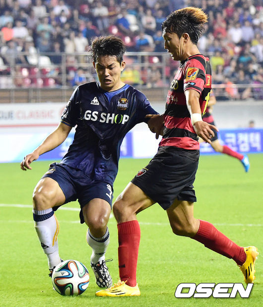 7일 오후 포항 스틸야드에서 열린 '현대오일뱅크 K리그 클래식 2014' 포항 스틸러스와 FC 서울의 경기 후반 이웅희와 고무열이 문전에서 볼다툼을 하고 있다.