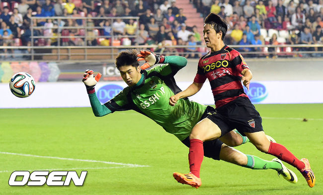 7일 오후 포항 스틸야드에서 열린 '현대오일뱅크 K리그 클래식 2014' 포항 스틸러스와 FC 서울의 경기 후반 포항 이광혁이 서울 유상훈 골키퍼가 못 잡은 공을 쫓고 있다.