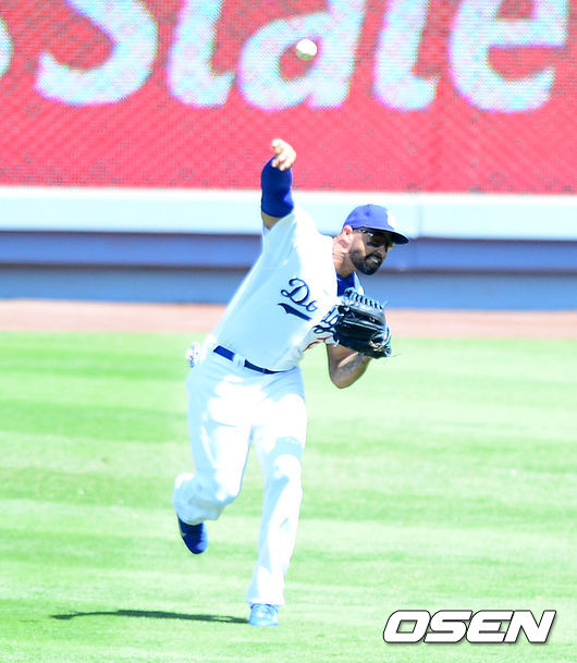 2회초 무사 만루에서 다저스 맷 켐프가 애리조나 마르테의 우익수 플라이에 홈으로 송구, 3루주자 몬테로를 아웃시키고 있다.