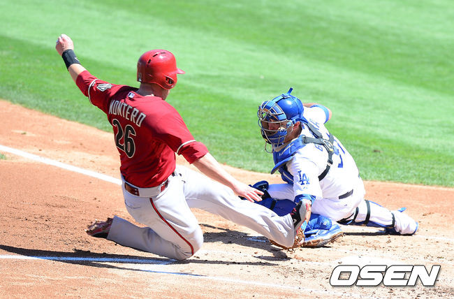 2회초 무사 만루에서 애리조나 마르테의 우익수 플라이에 3루주자 몬테로가 다저스 부테라에 태그아웃 당하고 있다.