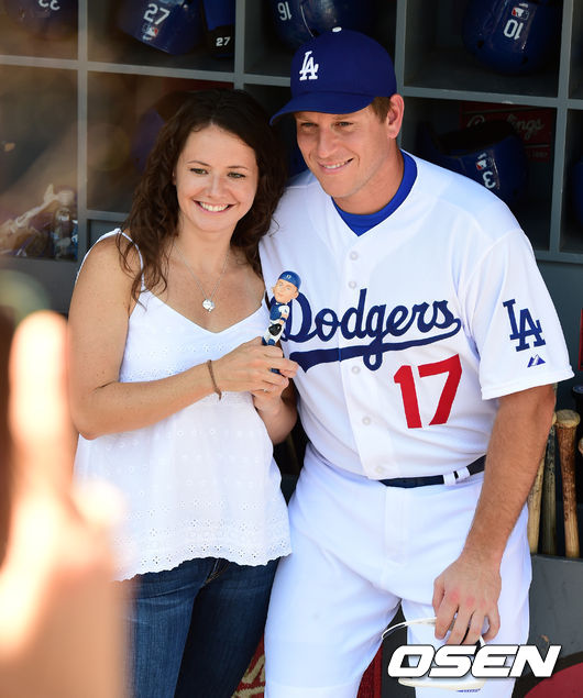 경기에 앞서 다저스 AJ엘리스가 버블헤드날을 맞아 아내와 포즈를 취하며 즐거워하고 있다.