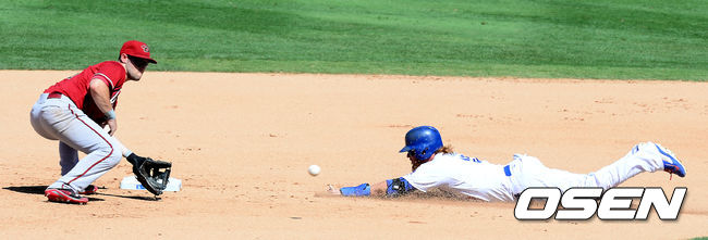 5회말 1사 1루에서 다저스 터너가 송구는 빨랐지만 태그가 늦어지며 2루 도루에 성공하고 있다.