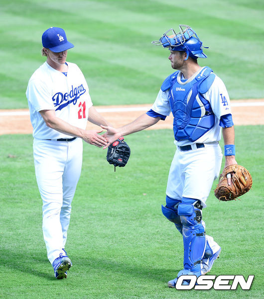 6회초 수비를 마친 다저스 그레인키와 부테라가 서로를 격려하고 있다.