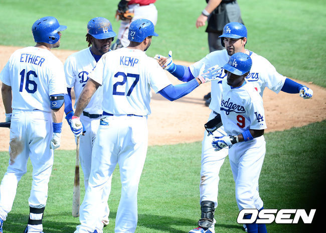 6회말 1사 1,3루에서 다저스 곤잘레스가 역전 스리런포를 날리고 홈을 밟으며 동료선수들과 기뻐하고 있다.