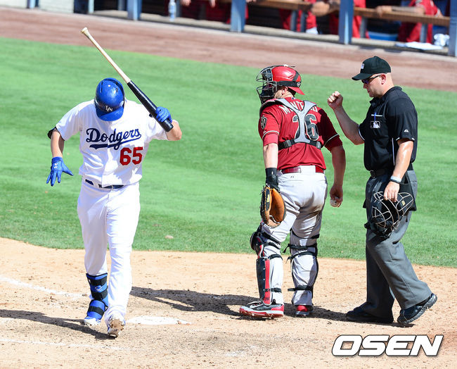 6회말 2사 만루에서 다저스 피더슨이 삼진으로 물러나며 아쉬워하고 있다.