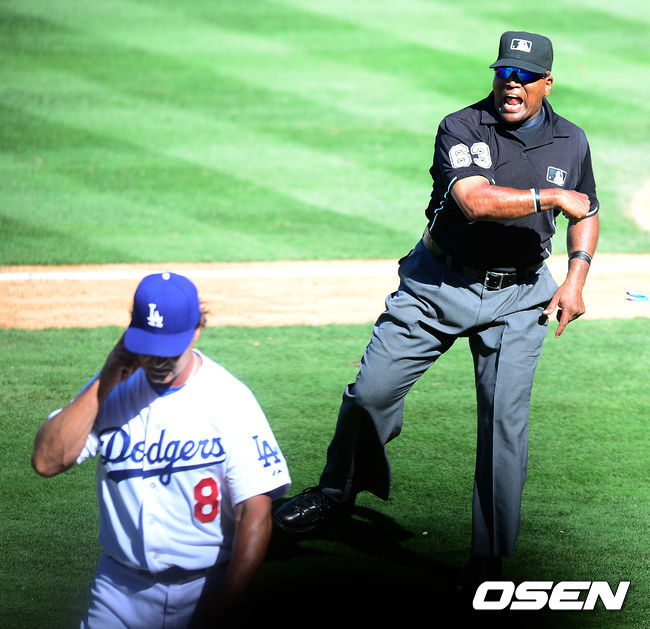 7회말 1사에서 다저스 매팅리 감독이 이디어가 몸에 맞는볼로 출루하자 항의하기 위해 그라운드에 나왔다가 퇴장 명령을 받고 있다.