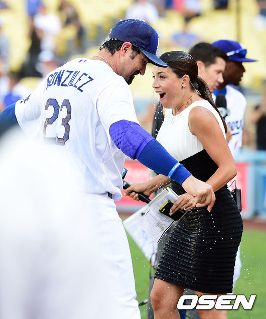 연타석 3점포를 날린 다저스 곤잘레스가 히어로 인터뷰 도중 축하 물세례를 받고 아나운서와 놀라고 있다.