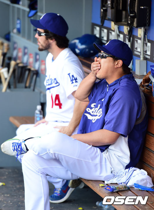 9회초 다저스 류현진이 더그아웃에서 해바라기씨를 먹으며 경기를 지켜보고 있다.