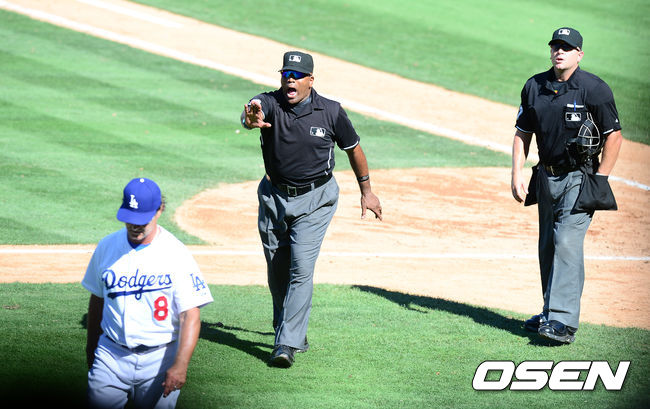 7회말 1사에서 다저스 매팅리 감독이 이디어가 몸에 맞는볼로 출루하자 항의하기 위해 그라운드에 나섰다. 이에 퇴장 명령을 받고 불만을 나타내고 있다.