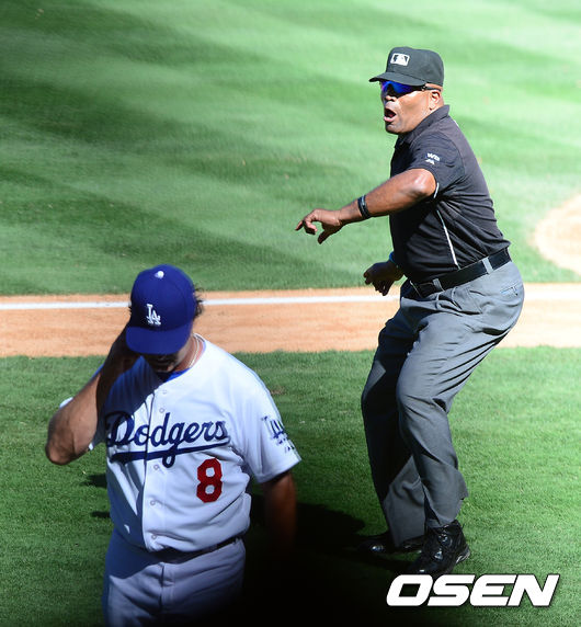 7회말 1사에서 다저스 매팅리 감독이 이디어가 몸에 맞는볼로 출루하자 항의하기 위해 그라운드에 나섰다. 이에 퇴장 명령을 받고 불만을 나타내고 있다.