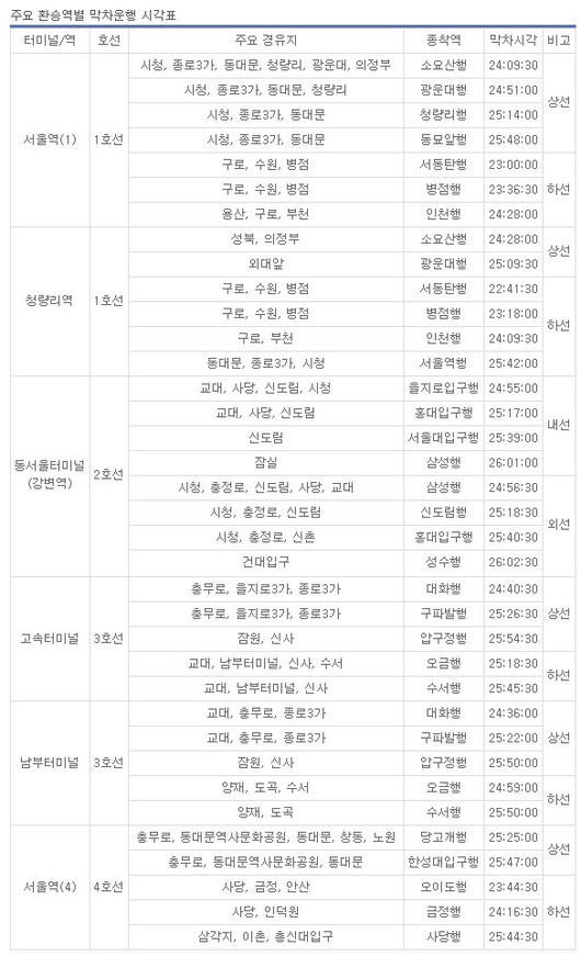 추석 연휴 지하철 운행시간 표, 주요 환승역별 막차운행 시간표.