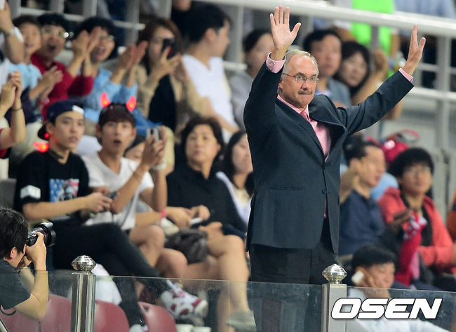 경기 시작에 앞서 대한민국 축구대표팀 슈틸리케 감독이 경기장을 찾은 축구팬들에게 인사하고 있다.