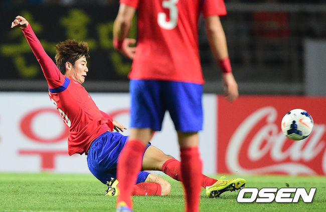 전반 한국 기성용이 상대 패스를 차단하고 있다.