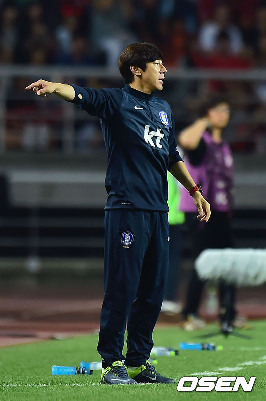 경기 전반, 신태용 코치가 작전지시를 하고 있다.