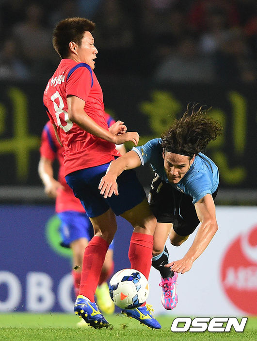 전반 한국 이명주가 우루과이 카바니의 드리블을 몸으로 막아내고 있다.