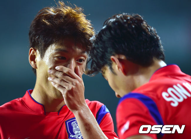 경기 후반 이청용과 손흥민이 코너킥에 앞서 이야기를 나누고 있다.