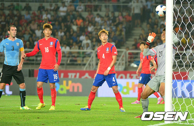 우루과이 히메네스에게 첫 골 허용하는 이범영,'당했다'