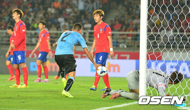 후반 한국이 우루과이 히메네스에게 첫 골을 허용한 뒤 아쉬워하고 있다.