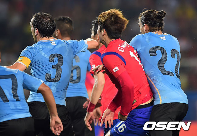 후반 43분 한국에게 결정적 상황이 나왔다. 한국의 코너킥 상황에서 디에고 고딘은 기성용을 견제하면서 팔꿈치로 슬쩍 그를 밀었다. 이와 동시에 카세레스는 기성용을 팔로 잡아챘다. 기성용은 넘어졌다. 사토 주심은 정확한 사인으로 페널티킥을 선언했다.