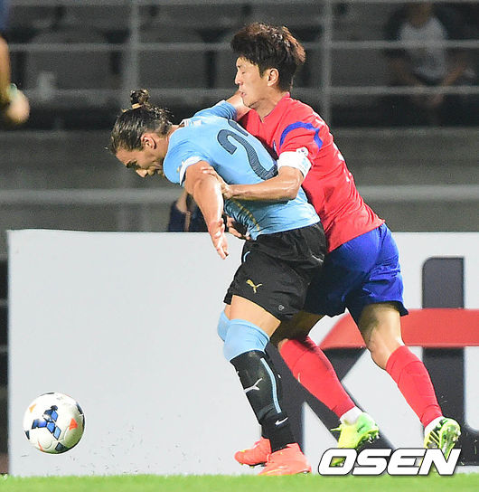 후반 우루과이 카세레스가 한국 이청용을 마크하고 있다./dreamer@osen.co.kr