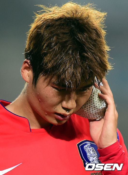 경기 후반 우루과이 고딘에게 팔꿈치 가격을 당한 기성용이 얼음 찜질을 하고 있다./youngrae@osen.co.kr