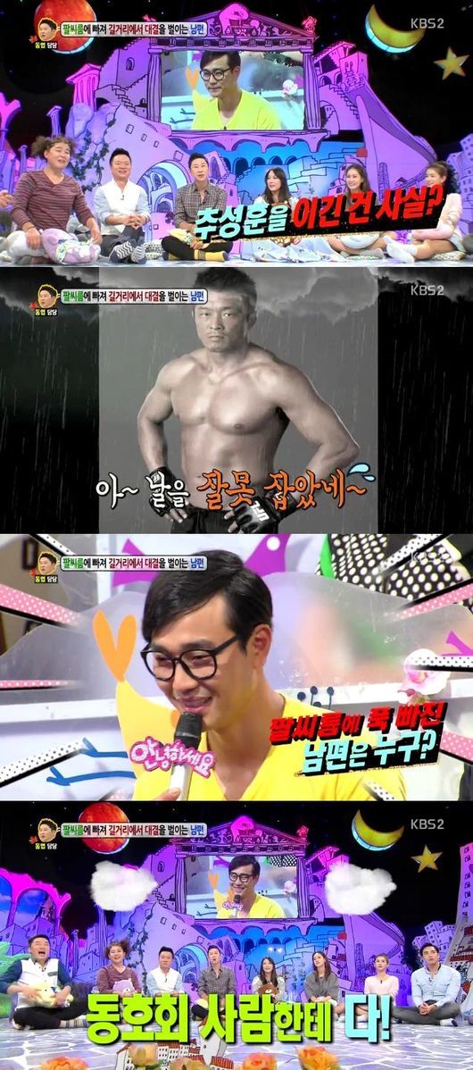 더불어 이날 팔씨름男의 아내는 "남편 때문에 걱정이다. 길거리에 팔씨름 대를 설치해 지나가는 사람들과 팔씨름 대결을 하고, 팔씨름에 지고 오는 날은 분에 못 이겨 잠도 못잔다"고 설명했다.