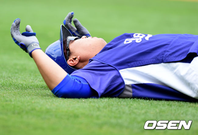 경기에 앞서 다저스 류현진이 그라운드에 누워 몸을 풀고 있다.