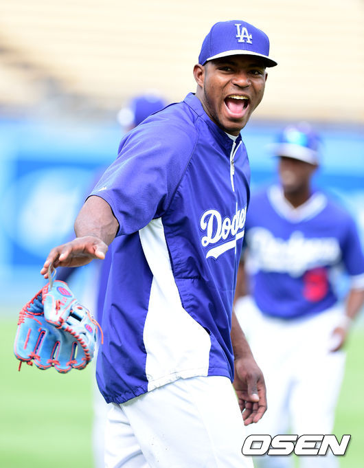 경기에 앞서 다저스 푸이그가 훈련을 하며 즐거워하고 있다.