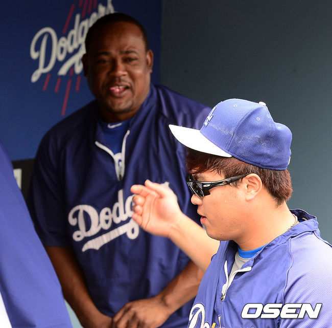 경기에 앞서 다저스 류현진이 훈련을 준비하며 유리베의 뒤통수를 때리고 즐거워하고 있다.