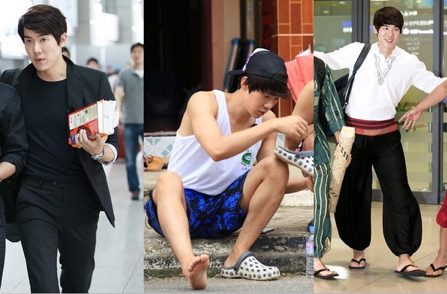 더벅머리에 슬리브리스 티셔츠와 꽃바지 차림으로 방수 슈즈에 들어간 이물질을 제거하는 모습이 영락없는 꽃거지 포스. 하지만 7월 14일 인천공항 귀국장에서는 라오스 현지인 포스를 뿜어내는 패션을 선보여 폭소를 자아낸다.