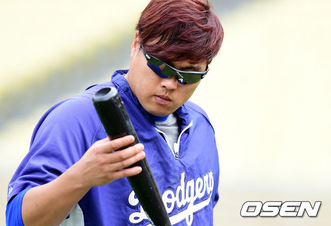 경기에 앞서 다저스 류현진이 타격 훈련을 마치고 더그아웃으로 항하고 있다.