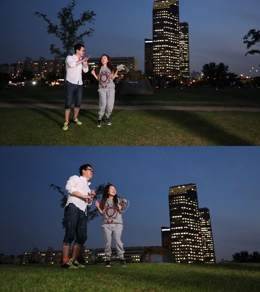 잔디밭에 텐트를 치고 자리를 잡은 두 사람은 서로에게 모기퇴치용 패치를 붙여주기도 하고, 캐치볼 게임을 하기도 하며 즐거운 시간을 보냈다. 또한 조리법이 독특한 ‘즉석 라면’과 ‘치맥’을 먹으며 강변 먹방에 나서기도 했다.