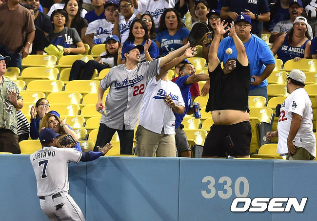 2회말 2사에서 외야석 관중들이 다저스 유리베의 솔로포 타구를 잡으려 하고 있다.