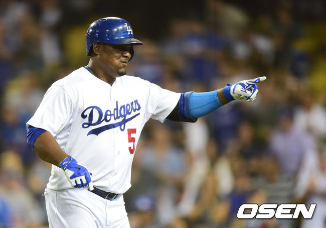 2회말 2사에서 다저스 유리베가 솔로포를 날리고 기뻐하고 있다.