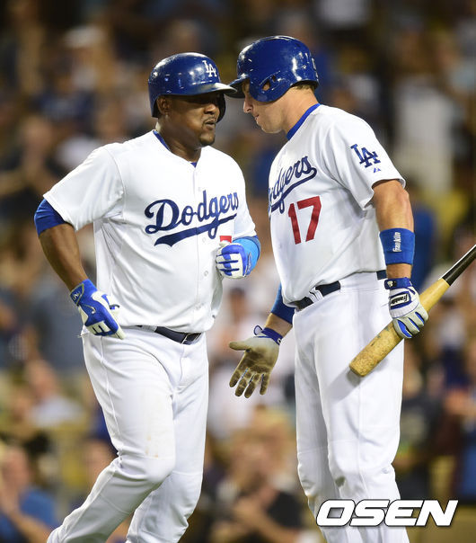2회말 2사에서 다저스 유리베가 솔로포를 날리고 엘리스와 기뻐하고 있다.
