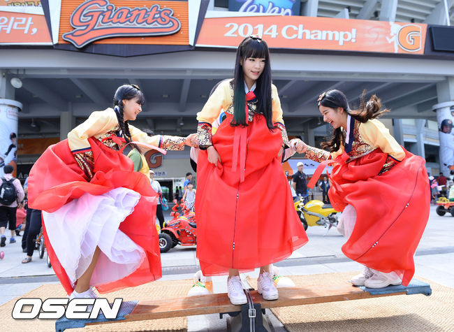 9일 오후 부산 사직구장에서 열린 '2014 한국야쿠르트 세븐 프로야구' 롯데 자이언츠와 SK 와이번스의 경기에 앞서 롯데 치어리더들이 추석이벤트 중 하나인 널뛰기를 하고 있다.