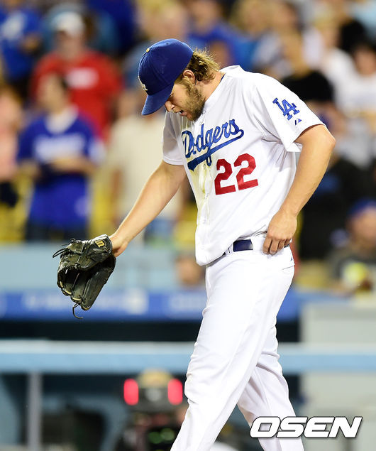 6회초 1사 1,2루에서 다저스 커쇼가 샌디에이고 리베라의 중견수 플라이에 푸이그와 엘리스의 연이은 실책으로 2실점 한뒤 아쉬워하고 있다.