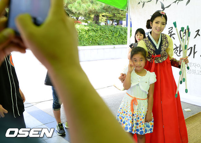 9일 오후 부산 사직구장에서 열린 '2014 한국야쿠르트 세븐 프로야구' 롯데 자이언츠와 SK 와이번스의 경기에 앞서 롯데 치어리더 박기량이 야구팬과 함께 기념촬영을 하고 있다.