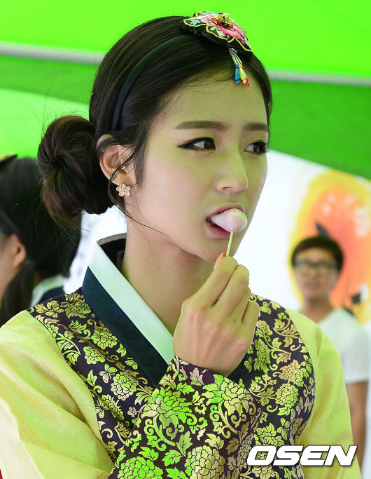 9일 오후 부산 사직구장에서 열린 '2014 한국야쿠르트 세븐 프로야구' 롯데 자이언츠와 SK 와이번스의 경기에 앞서 롯데 치어리더 박기량이 송편을 먹고 있다.