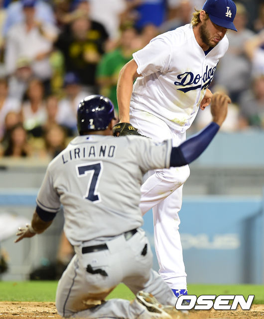 6회초 1사 1,2루에서 다저스 커쇼가 샌디에이고 리베라의 중견수 플라이에 푸이그, 엘리스의 실책으로 1루주자 리리아노가 홈에서 세이프되자 아쉬워하고 있다.
