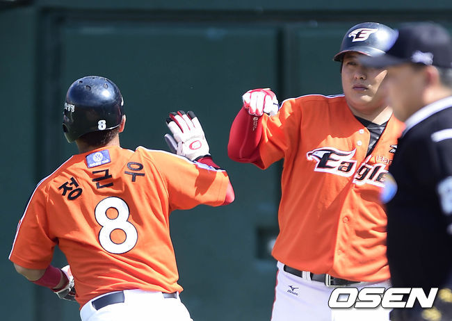 9일 오후 서울 목동구장에서 열린 '2014 한국야쿠르트 프로야구 세븐 프로야구' 넥센 히어로즈와 한화 이글스의 경기, 1회초 1사 주자 3루 한화 김경언의 희생플라이에 홈을 밟은 정근우가 김태균과 기쁨을 나누고 있다.