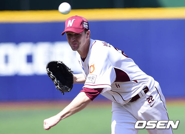 9일 오후 서울 목동구장에서 열린 '2014 한국야쿠르트 프로야구 세븐 프로야구' 넥센 히어로즈와 한화 이글스의 경기, 1회초 넥센 선발 투수 밴 헤켄이 힘차게 공을 던지고 있다.
