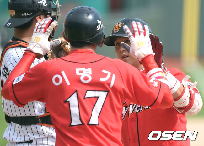 1회초 1사 2루 최정의 투런포로 홈을 밟은 이명기와 최정이 하이파이브를 나누고 있다.