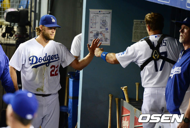 8회 수비를 마친 다저스 커쇼가 엘리스와 하이파이브를 하고 있다./ jpnews@osen.co.kr